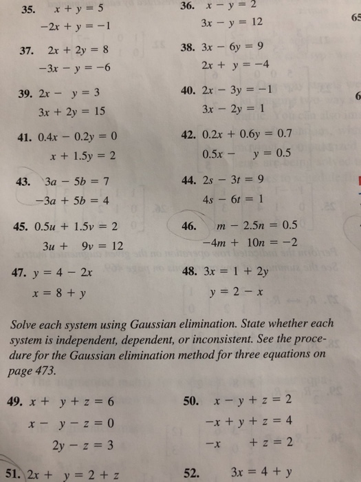 Question 1262 Use elimination method in solving this;tnx x3y=5 2xy=5 Answer by jim_thompson5910 () ( Show Source ) You can put this solution on YOUR website! (x,y)=(4,1) x=2y6 in the second equation, define x in terms of y 2(2y6)3y=5 plug back into the first equation 4y123y=5 distribute 7y12=5 7y=7 y=1 solve for y Then, go back to the other equation and plug this value in for y x=2(1)6 x=26 x=4Solve by Addition/Elimination x4y6z=1 , 2xy2z=7 , x2y4z=5 x 4y 6z = 1 x 4 y − 6 z = − 1 , 2x y 2z = 7 2 x − y 2 z = − 7 , x 2y 4z = 5 − x 2 y − 4 z = 5 Choose two equations and eliminate one variable In this case, eliminate x